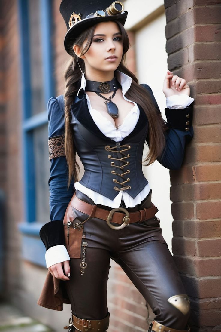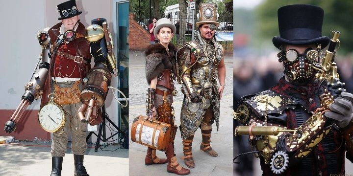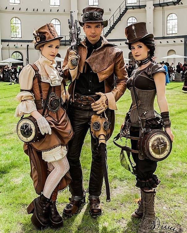 Викторианская мода. Строгие фраки у мужчин и пышные платья с корсетами у женщин в представлении не нуждаются. Многие элементы костюма слегка видоизменены: юбки укорочены, на подтяжки добавлены латунные элементы. Обязательно присутствие кожаных вставок на аксессуарах, карманных часов на цепочке и шляп-цилиндров с ремешками и шестеренками.